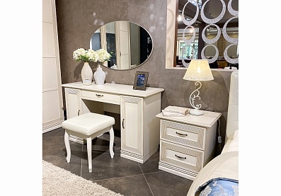Чтобы сделать интерьер более завершенным, вы можете дополнительно приобрести металлические аксессуары в бронзовых оттенках и абстрактные постеры с яркими акцентами. Для большего удобства композицию можно завершить мягким пуфом или банкеткой в тон мебели. Конечно же, не забудьте про туалетный столик, который сделает утренние и вечерние ритуалы еще приятнее.