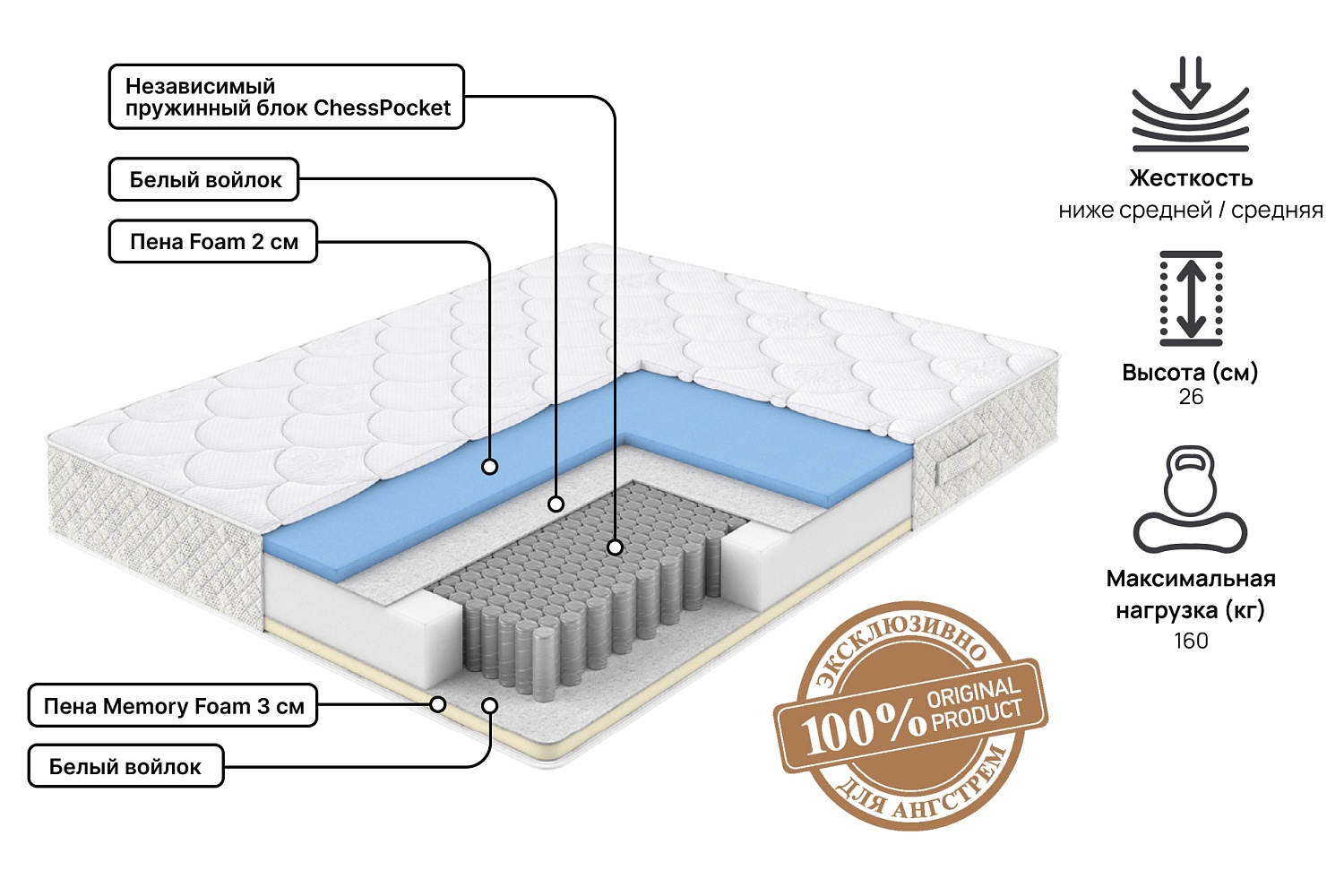 Войлок, Высокоэластичная пена Foam, Кокос, Независимый пружинный блок ChessPoket, Пена с памятью формы